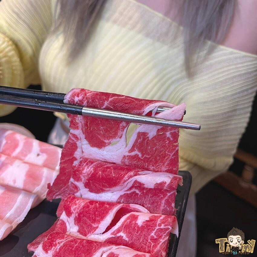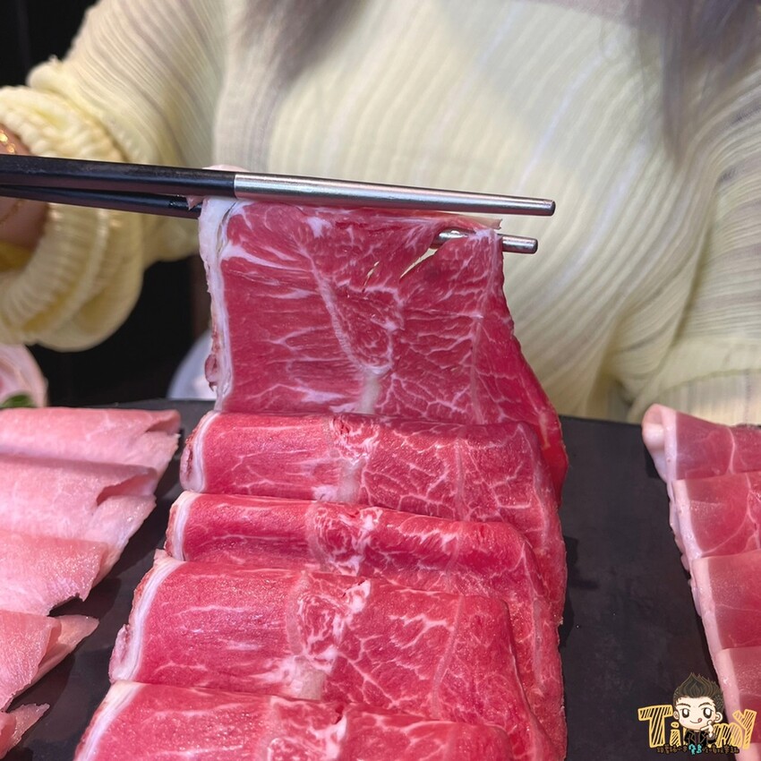 美國1855嫩肩板腱牛肉有Q軟口感,油花比例適中,涮個5分熟就有嫩中帶Q的口感喔!