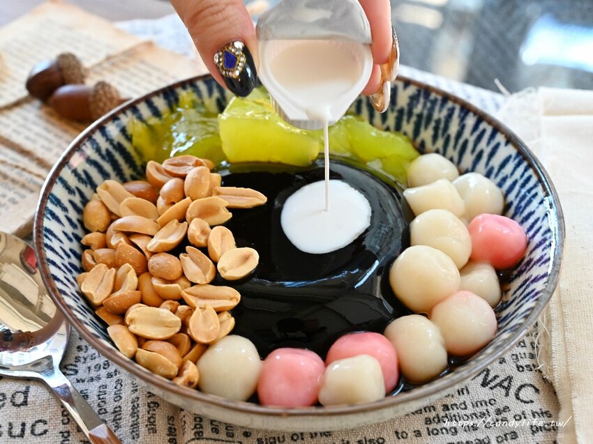 一樣可以任選三種料,淋醬可以選擇搭配奶油球或椰奶,糖糖選了奶油球,配料部分選了硬花生、湯圓及粉粿,山裏山外的嫩仙草也是店家自己手工製作的,口感超古溜,淋上奶油球,多了奶香味吃起來更迷人,誰說硬花生只能配燒仙草,搭配嫩仙草享用也好吃唷