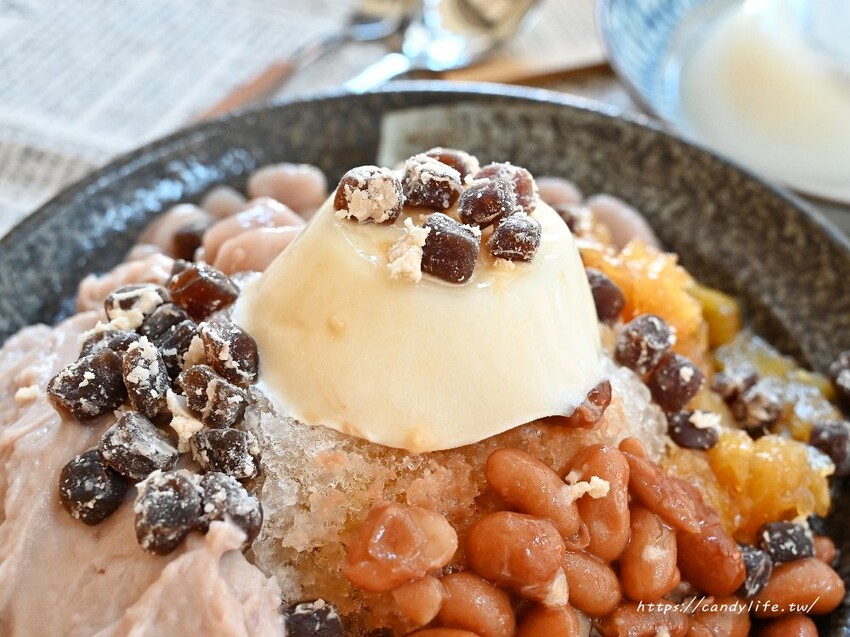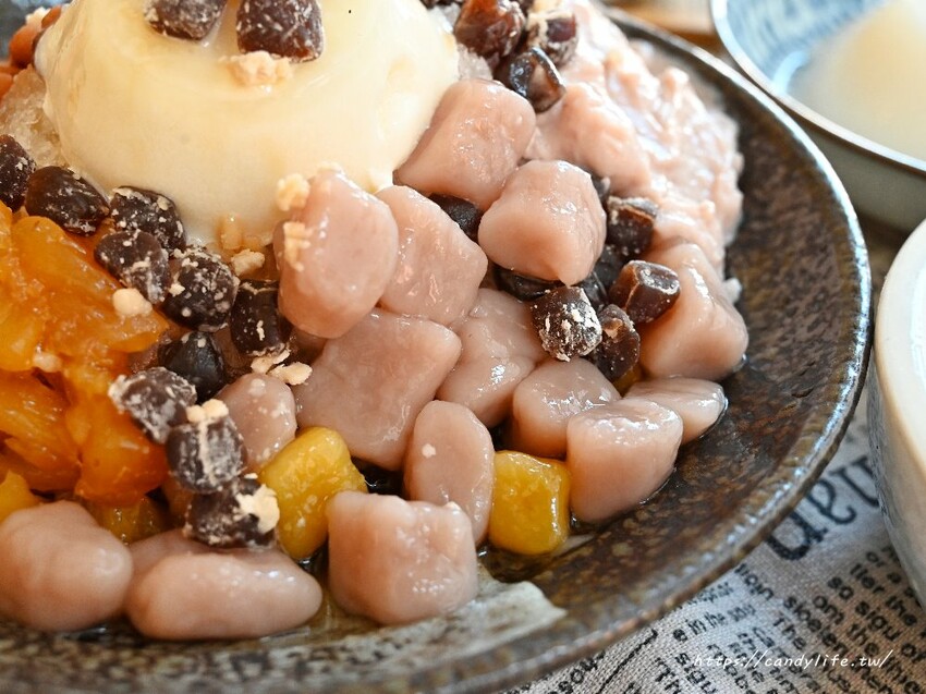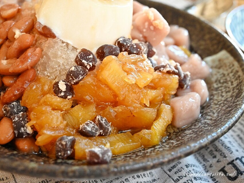 喜歡剉冰一次吃到多種配料的朋友,可以像糖糖這樣加價加料直接升級成六種冰,配料有芋圓、麻薯丁、鳳梨、奶酪、大豆、芋泥及奶酪,一碗六種配料超澎派,可以選擇淋上黑糖或焦糖,加煉乳免費