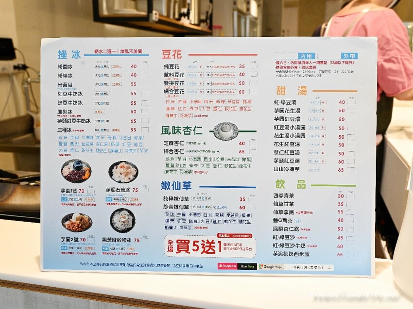 山裏山外的品項非常多,有剉冰、芋圓、豆花、嫩仙草、杏仁凍、甜湯及飲品,來店自取還可享買五送一優惠