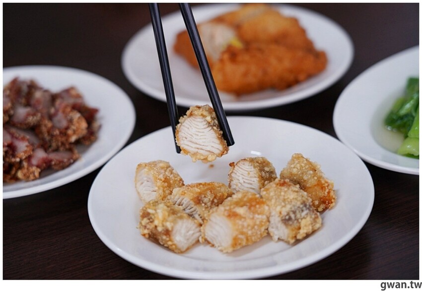 紅糟肉吃起來帶有微微酒香、醃漬也很入味,朋友才吃一塊就說好好吃,店家特地選用豬梅花來製作紅糟肉,肥瘦剛好,吃起來比較不膩口,外皮一樣有裹粉油炸,帶著酥脆口感