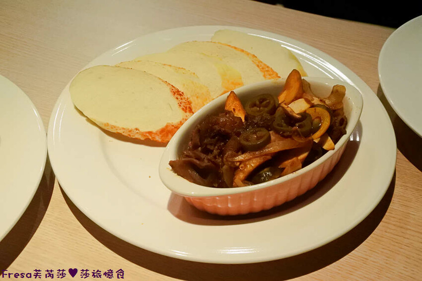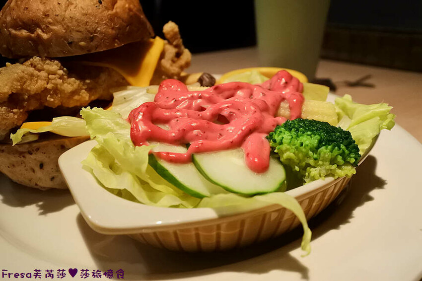 沙拉上頭的淋醬很特別,有點像是火龍果的酸香,超開胃解膩!