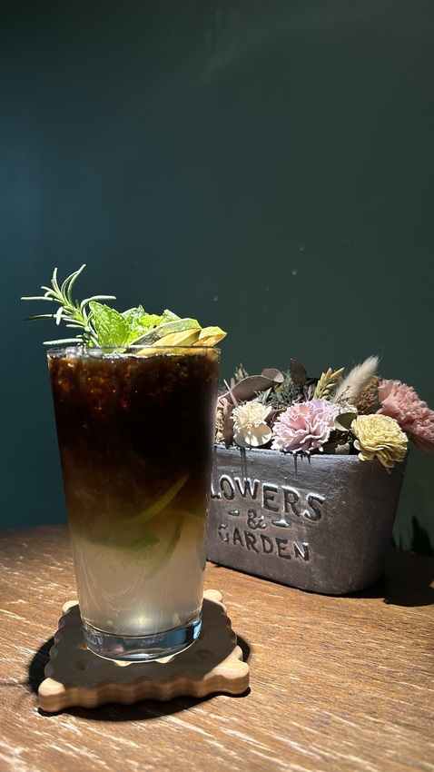 店內環境不大約莫只有十來個座位,喜愛坐吧檯的我請老闆娘幫我們安排在吧檯區就坐。這次點了期間限定的抹茶舒芙蕾跟我愛的檸檬咖啡,點一杯飲品可以以優惠價獲得一顆現烤的司康,剛好就是我們想吃的完美組合(我很想點肉桂捲,但真的吃不下)。咖啡檸檬氣泡飲不得不說從美觀上就先吸一波眼球,把整杯弄得像mojito般碎冰加上薄荷葉,連氣泡飲開罐後隨飲附上都如在酒吧般,如果上方濃縮咖啡換成威士忌,也完全無違和。老闆啊老闆,我送上我最高的敬意給你。不要以為他只是看起來漂亮而已,從整杯喝下去的順口度與完全不會死甜就知道店家用料實在,所使用的檸檬不是如連鎖超商的濃縮果汁,而是天然的檸檬去製作而成。