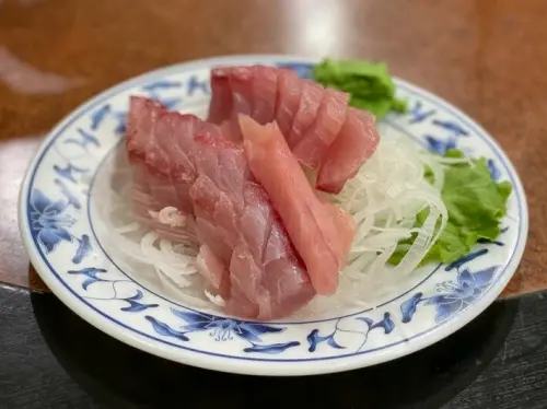 阿挺海鮮每日的生魚片種類都不一樣,老闆今天有的魚獲是紅甘,我們切了一盤生魚片。紅甘是秋日很適合點的生魚片,肉質清甜,看起來略帶點粉紅色的色澤