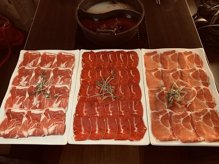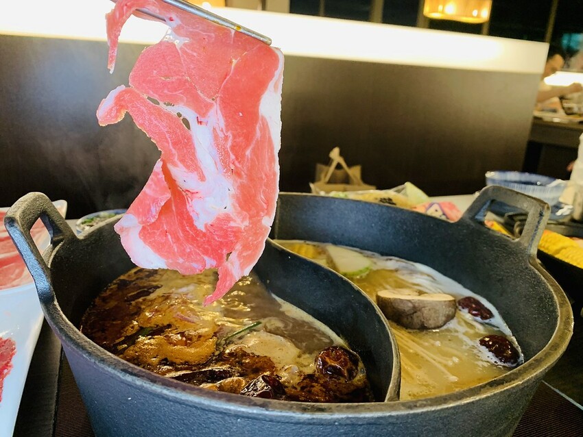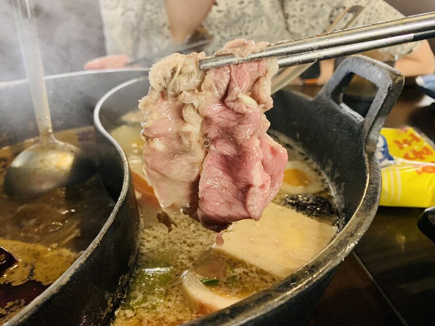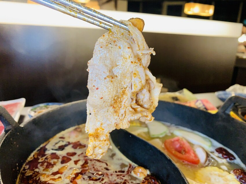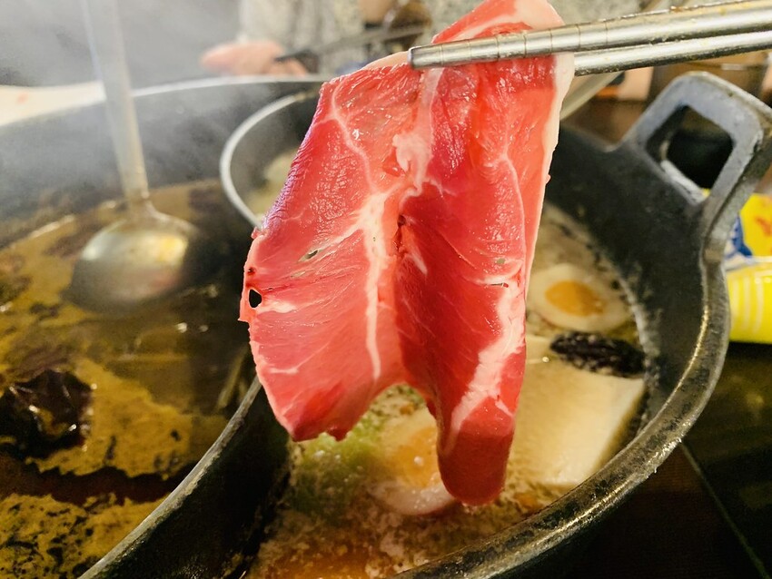 湯滾了之後,下鍋涮了幾下後,這個嫩肩羊帶有厚度的油脂,又有口感、有夾著麻辣的香氣。