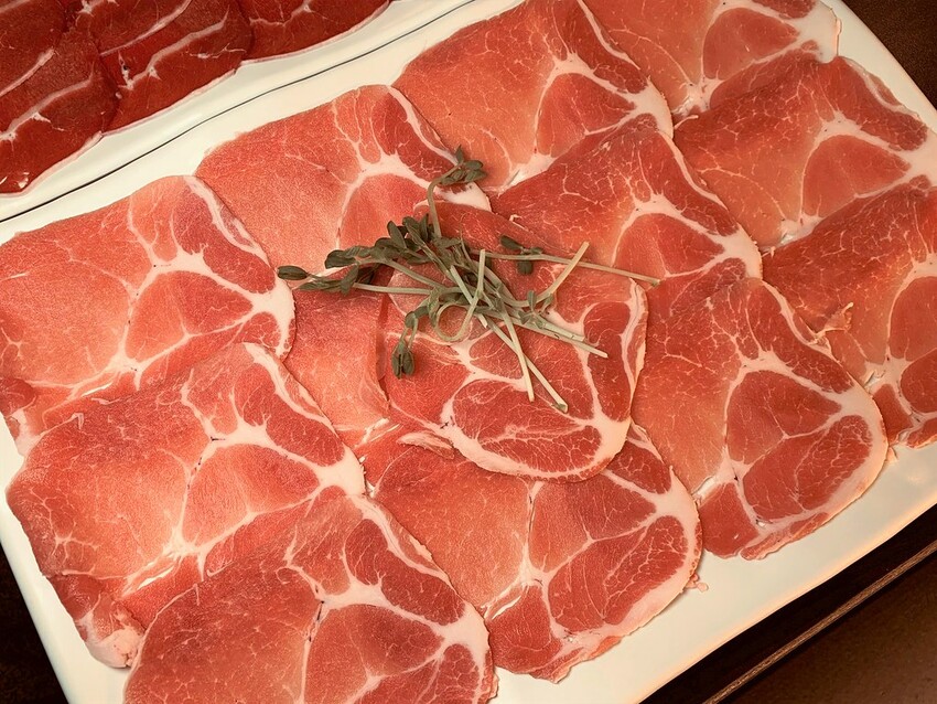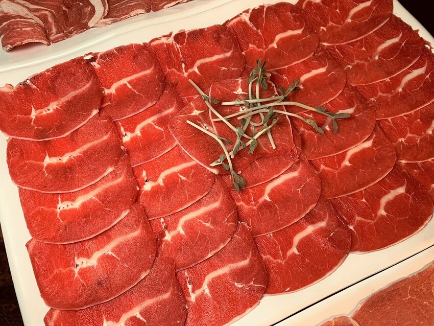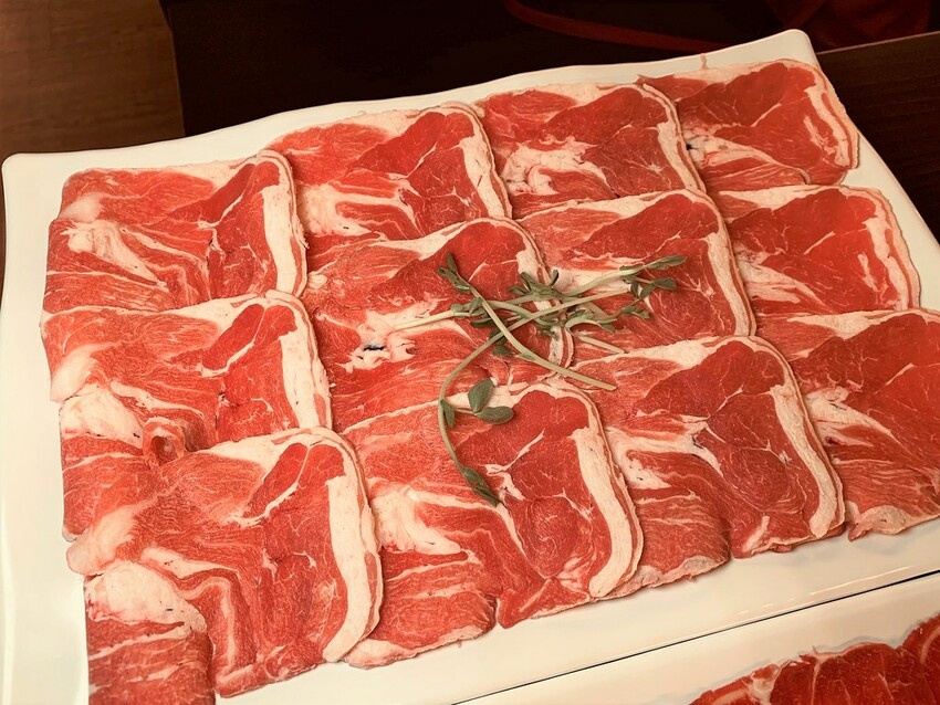 肉多多非常的豪氣,一大盤超多肉片,嫩肩羊咩咩12片、紐澳嫩肩牛25片、活力梅花豬也有13片之多。