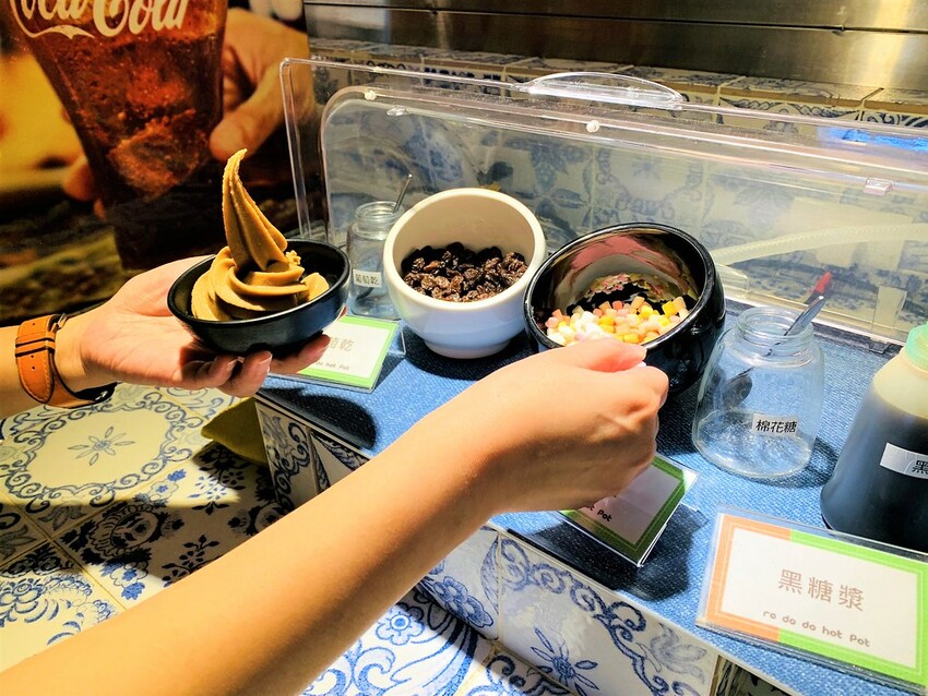 甜蜜蜜的《黑糖奶茶霜淇淋》,還可以加點料,吃完濃郁的火鍋湯頭和肉片之後,這一定要嚐一口,馬上清爽起來,