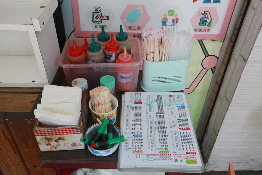 櫃檯旁放置菜單、醬料及餐具供自取使用。
