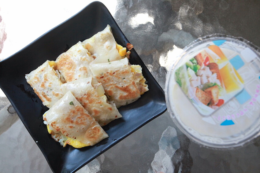 這蛋餅餅皮是買現成餅皮來製作。