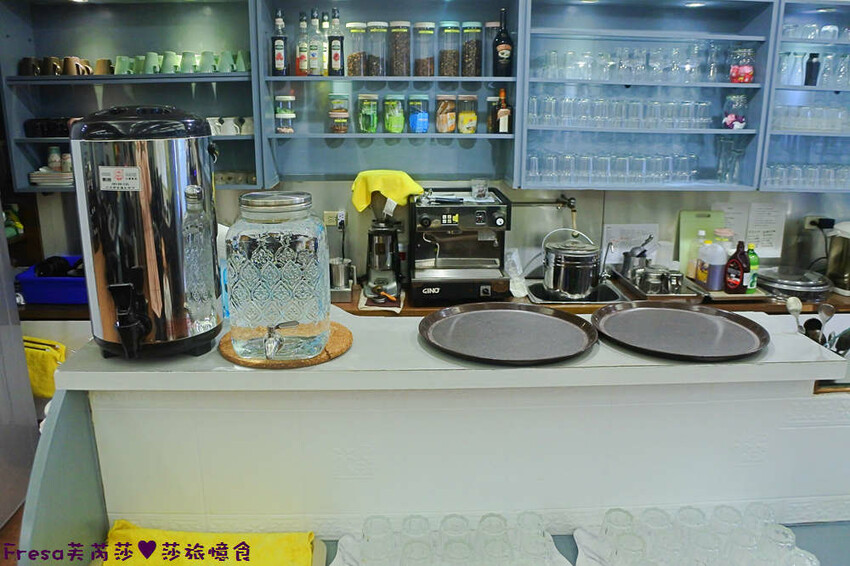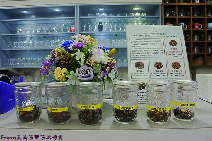 櫃檯旁有開水自取,並且提供花香果飲試聞瓶.