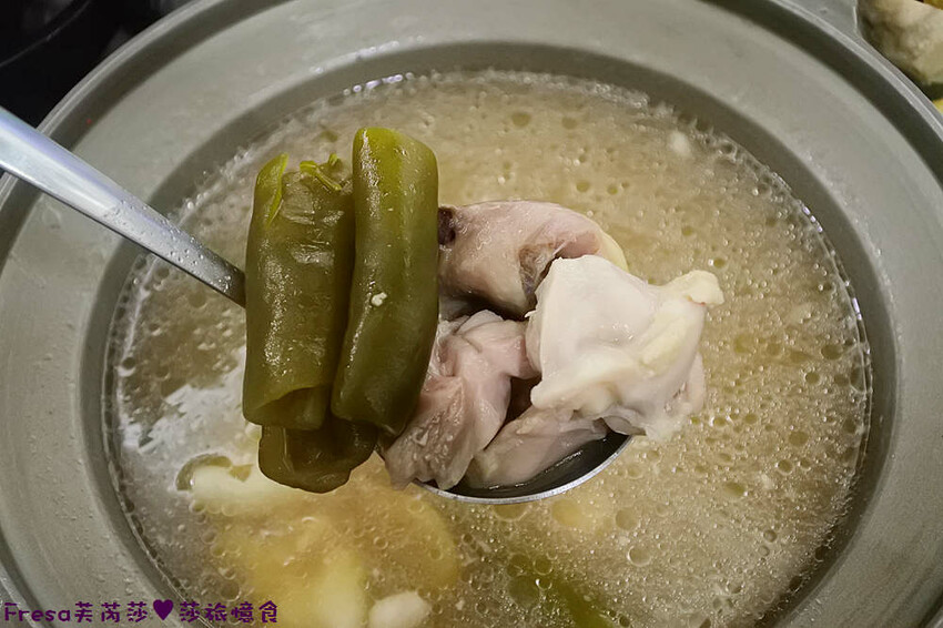 選用一整罐剝皮辣椒煮成湯底搭配整支雞腿.