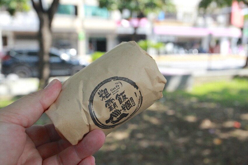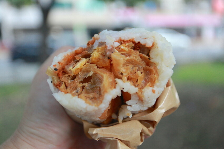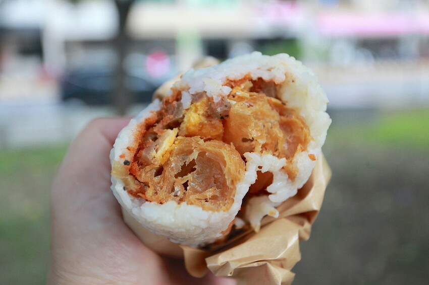 這飯糰裡面包覆著有油條、肉鬆、酸菜、菜圃及鹹鴨蛋蛋黃。