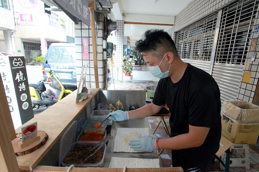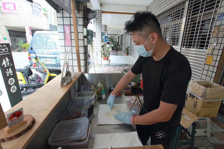 店面外騎樓放置料理攤位做起生意,這木作攤位是充滿日式氣息。