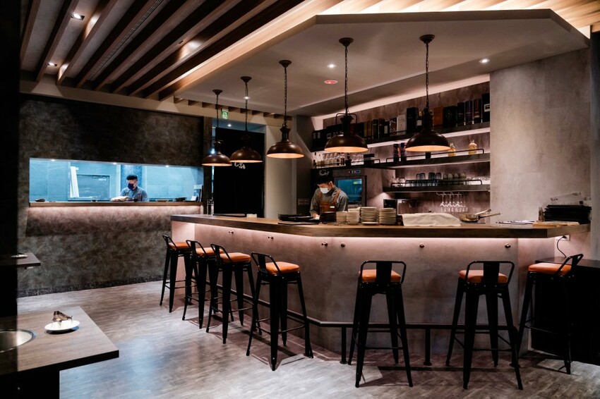 走進店內,延續外觀的日式極簡設計,隱焱匠內部用餐空間分成兩個部分,有個可近距離看到調酒、沙瓦等飲品製作吧台的是開放式用餐空間。