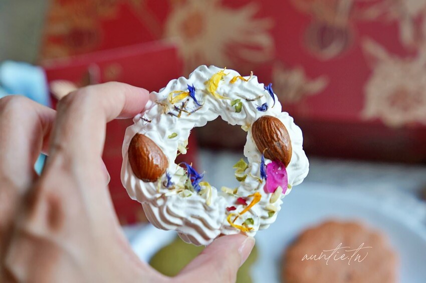 最令人眼睛一亮的就是水蜜桃花圈馬林糖,與一般小顆像是奶油擠花的馬林糖不同,做成像花圈造型還灑上食用花瓣,吃起來是香甜的水蜜桃香,口感酥脆;