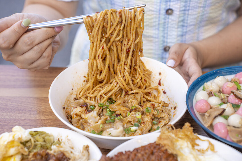 油潑辣子麵配上一顆顆餡料飽滿的紅油抄手超級搭,一口咬下超級多汁涮嘴,沾上辣子麵的醬料口感更加有層次!