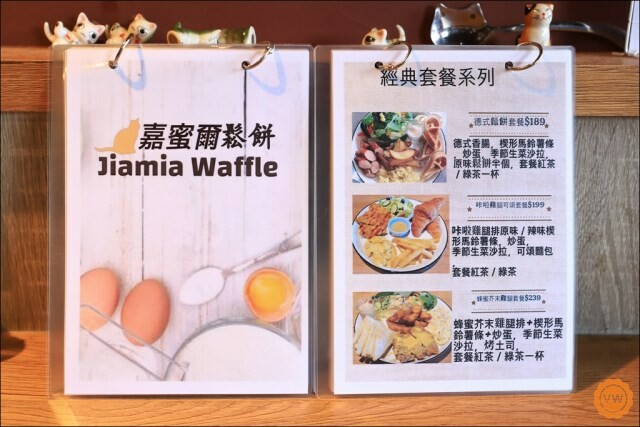 餐點品項除了可以單點之外,也可以搭配飲料及小點升級為套餐。主要有經典口味甜鬆餅、手工果醬鬆餅、鹹口味鬆餅、特色手工醬鬆餅、把料藏起來鬆餅、蛋奶素鬆餅及熱壓吐司,皆可升級套還享有飲料及炸物拼盤,也只要加價89元,另外若是想要豐富口感,加料區還有多種品項可挑。