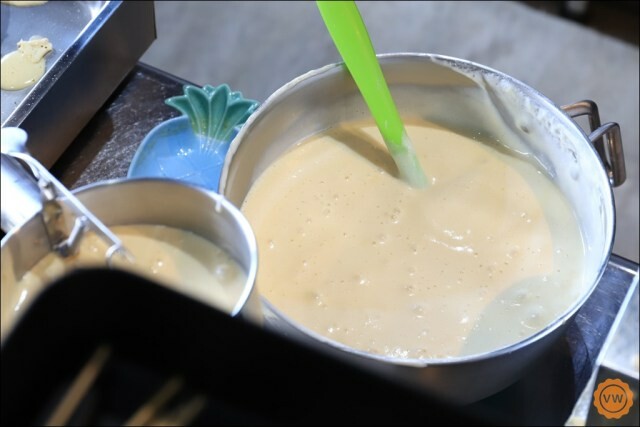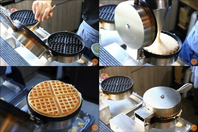 只要站在吧台前就可以看到店家製作鬆餅的實況,話說這一鍋鬆餅糊,都是每日使用紅心雞蛋及麵粉新鮮現打而成,並非是使用一般市售的現成鬆餅粉,所以在炎熱高溫的環境下,不僅容易消泡也容易變質而損壞,但是為了客人的健康,哪怕是成本較高,老闆也堅持只為客人製作健康的鬆餅!