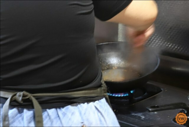 在烤製鬆餅的同時,老闆娘則是配炒打拋豬,拌炒的同時更是瞬時香氣四溢,讓人猛吞口水,之後再現煎一個半熟的荷包蛋。