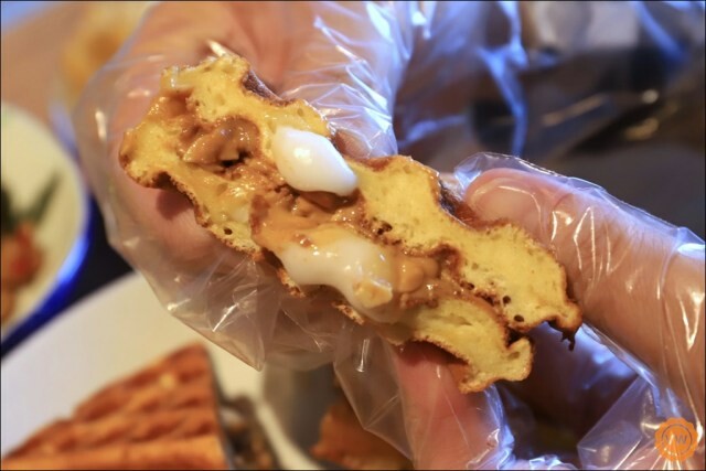 新鮮現烤的鬆餅在烤製的同時加入口感Q彈的麻糬,完成之後再抹上帶有顆粒的花生醬,一口咬下時滿滿的蛋香令人滿意之外,每一口都還可以吃的到濃郁的花生醬香,咀嚼時鬆餅特有的紮實口感再加上Q彈的麻糬,超好吃!