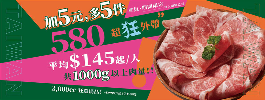 總共3000CC的湯品+1000克的肉量,還加贈5件,平均一人才花$145!