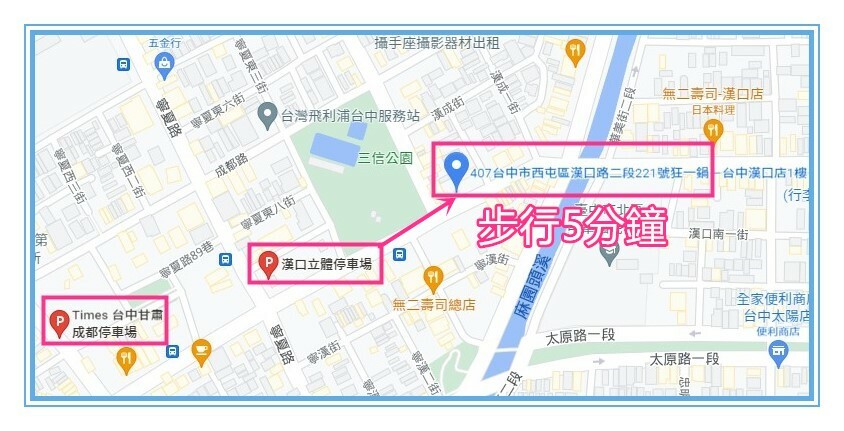 開車來狂一鍋漢口店也不用太擔心停車位難找,因為附近還有二個收費停車場🅿️