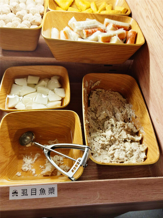 現打的虱目魚漿,旁邊還有冰淇淋挖勺可以挖,我們都迫不急待趕緊挖進盤子裡