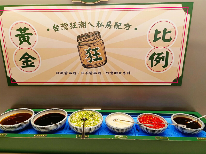 醬料區總共有6種配料和醬汁可自取,牆上還有如何調出黃金比例的說明