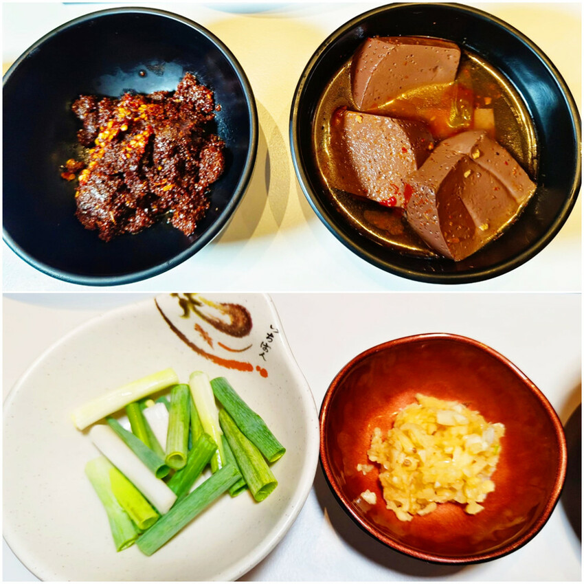 加入蒜頭,蔥段和麻辣醬及鴨血現炒,先把鍋子爆香後,吃起來的火鍋更夠勁