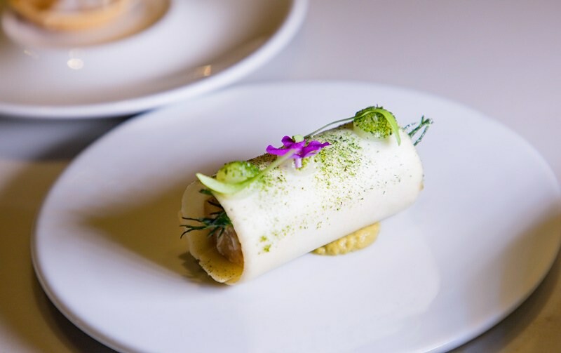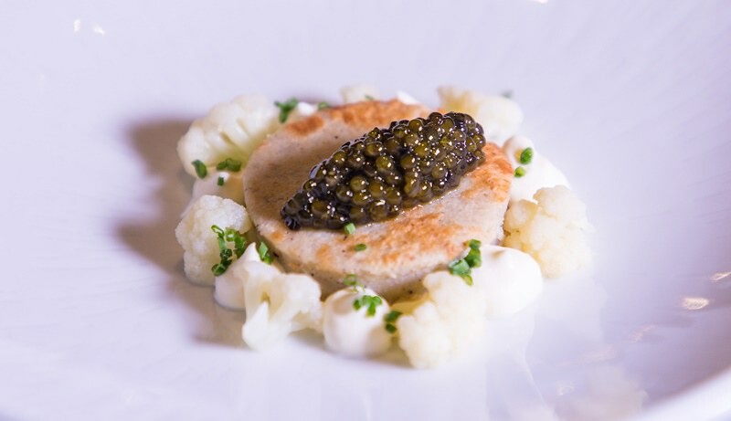 酸乳 / 魚子醬,說到高端食材,就不能不提魚子醬,Jimmy自詡吃過世界上八成的魚子醬都已吃過,餐廳裡用的義大利Oscietra Caviar魚子醬。Jimmy主廚說一般歐洲人會搭配法式酸奶和蕎麥煎餅,但他發現台灣比較少人這樣吃;同時他也發現國外星級主廚慣用白花椰菜搭配,於是Jimmy主廚傳統與現代結合再加以改良搭配,入口盡是魚子醬的鹹香,半點沒有腥臭,時不時跳出的酸奶真的又彈tone又對味,蕎麥煎餅軟嫩帶著咬勁後的麵糰香甜,外面是白花椰菜。