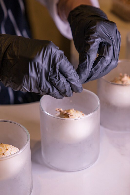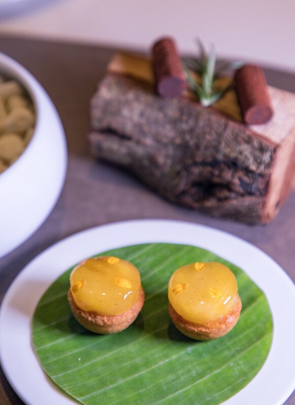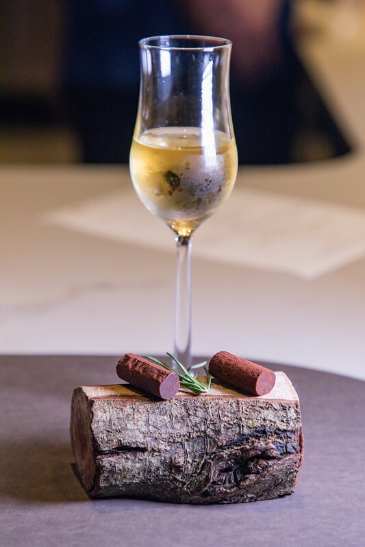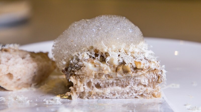 蒜味起司蘑菇,Jimmy主廚說台灣人工培育蕈菇質量好,他以酸種麵包塗上蒜味布瑞起司、蘑菇泥、炒香的杏鮑菇丁,再現刨義大利六十個月的Parmigiano帕米吉阿諾乾酪,上面是牛肝菌泡泡。吃在嘴裡盡是磨菇特別的香甜、起司的香氣有一點像藍紋起司,和酸種麵包非常的搭,咀嚼後除了麵包的酸甜外,還有淡淡磨菇炒過的油香。
