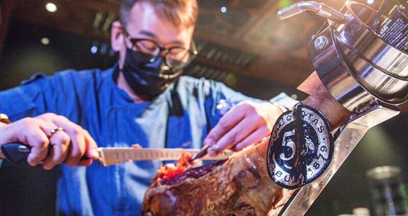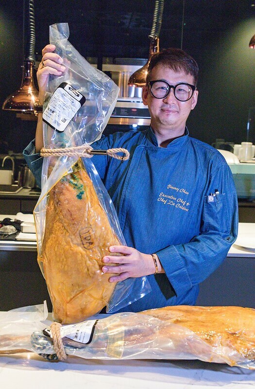 飯後和Jimmy主廚又聊了一會兒,他還拿出兩隻很特別的火腿,說是目前西班牙最紅的四年、五年火腿,希望下次有機會可以品嚐到。