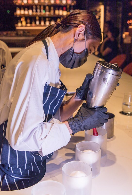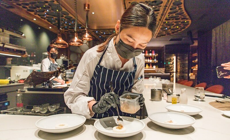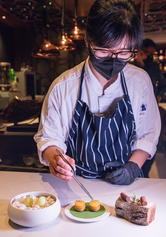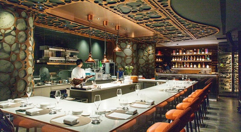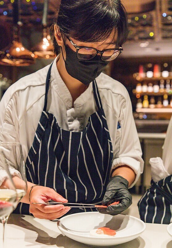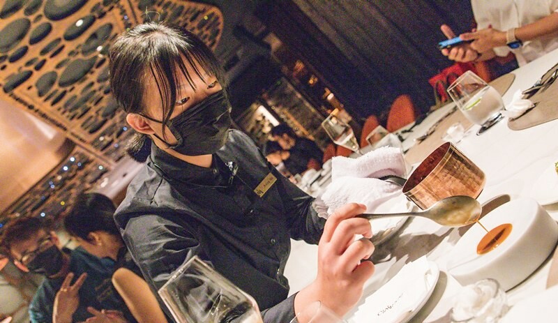 這裡比一般開放廚房更加開放,容易造成煙霧的料理在廚房內部進行,料理、裝盤除了在中間的調理台外,更多的是更接近客人的桌邊即時服務,甚至餐盤上的醬汁也在客人的面前完成,使得廚師、服務生、客人有了更親切的接觸,不管視覺、味覺還是對話。