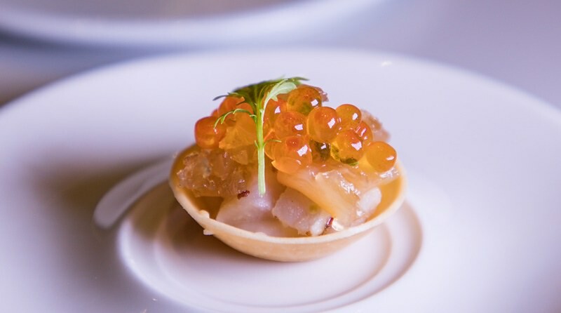 鮮魚五味結合的小塔,底部派皮非常脆,上面堆著四種不同口感、不同味道的生魚切丁及鮭魚卵,入口爆、綿、化,還帶著應該是某種魚皮討喜的爽脆。