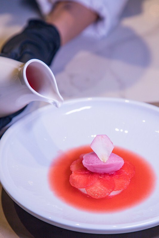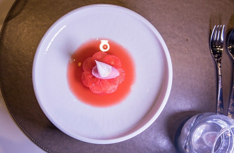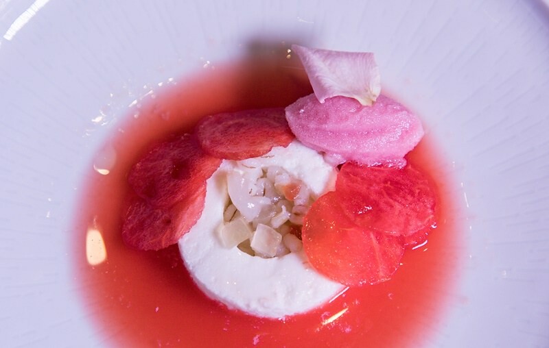 主甜點 華寶西瓜 / 荔枝 / 玫瑰,西瓜用的是華寶大西瓜,底層外圈白色的荔枝冰糕吃起來有一點像莫札瑞拉起司,中間放的是很特別的西瓜白玉(西瓜、白玉粉等,配料是薄荷葉等,調料是白芝麻、砂糖、生薑等,通過煮製而成),和荔枝肉還有小薏仁。一片一片疊上西瓜圓片。還有嫣紅色玫瑰雪葩(像冰沙又像冰淇淋),再倒入西瓜冷湯,好像紅色池塘的紅荷花,美得亂七八糟。口感端十分清爽、清涼、清甜,好吃到我拿起碗直接扒,季節感十足,要說是這兩年我吃過最好吃的甜點也不為過。