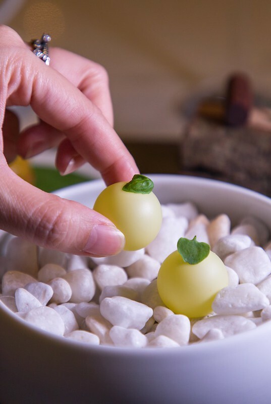 最後這個像水果的糖球,可愛得捨不得吃,入口是薄脆的糖皮,裡面像吃無籽、無肉的葡萄般的水份爆裂,伴隨著水果的酸酸甜甜,好特別也好吃,雖然我完全不知道是什麼做的,怎做的....。
