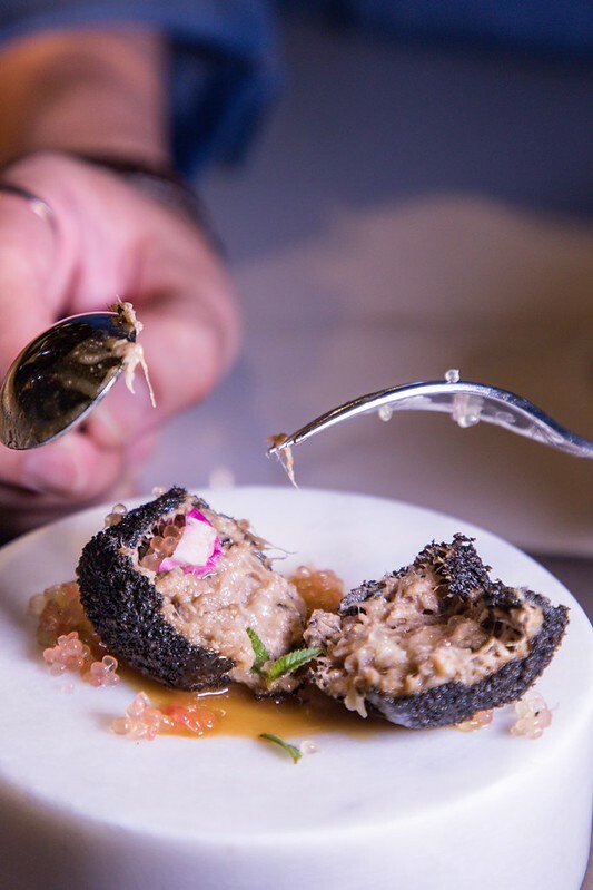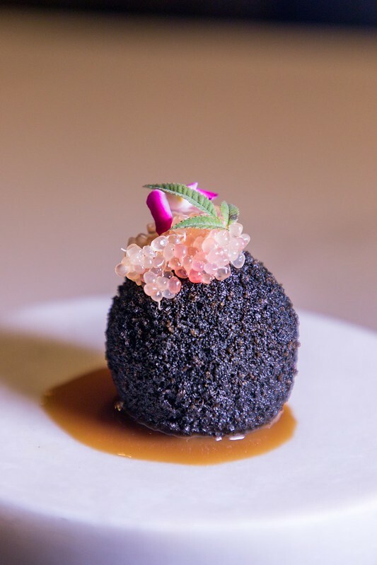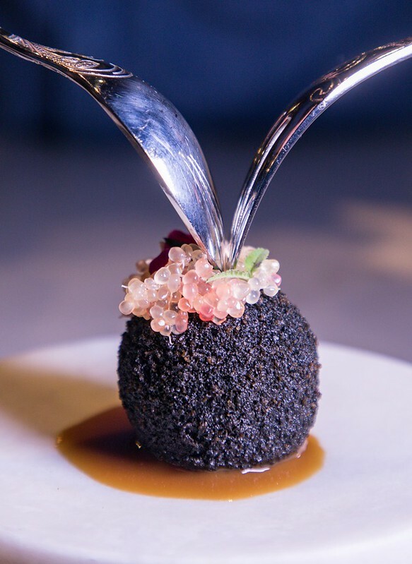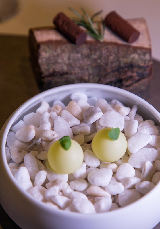 像是知道我要取什麼角度拍攝般的在碳球之上略停,等我把完後再切開,頓時冒出微微的輕煙,嚇得我忘了按快門,然後Jimmy主廚叉起其中的一半,俏皮的伸向我,示意要餵我。不客氣一口咬下後,發現裡面居然是熱的..因為一開始我以為是涼菜。裡面是肉泥般的化口感,帶著適度油甜的肉香隨著每一口咀嚼而來,當咬到上面泡泡時,爆汁的同時一陣酸衝了出來,Jimmy主廚這時才說那些泡泡是用檸檸和一切水果製成的,但怎做語帶保留,且說下回分解。