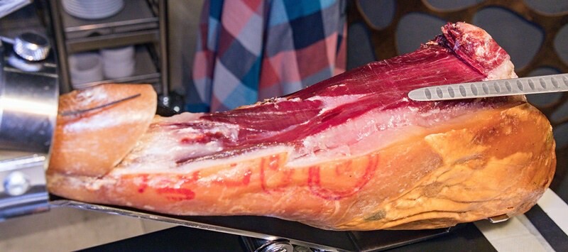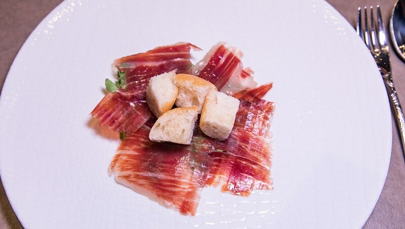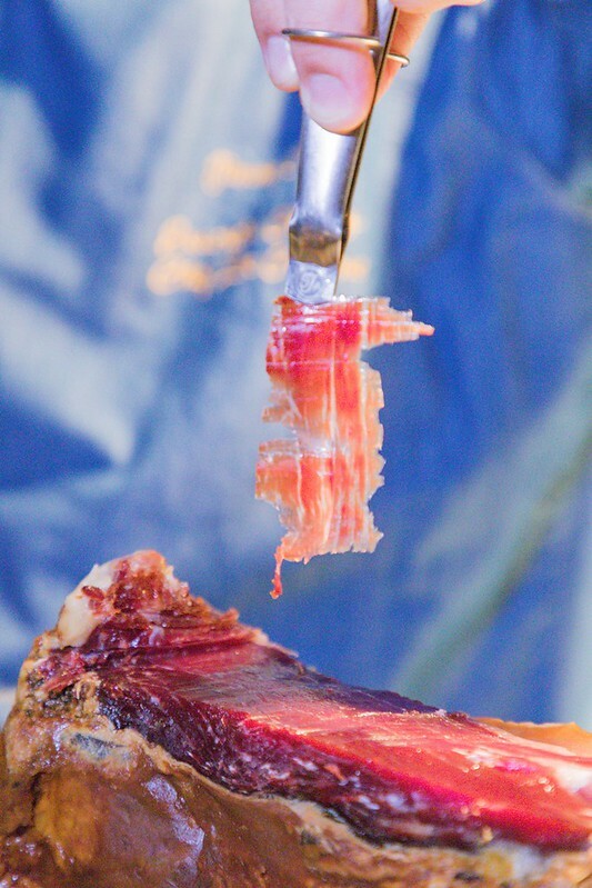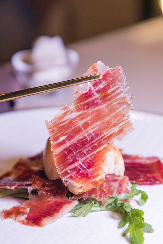 西班牙伊比利火腿。這天我們吃的是5J 頂級黑標,我說真的只要你吃過這種伊比利火腿,就會跟我一樣回不去....,深紅色肉、乳黃色大理石油花,微光透清亮,看似薄吃在嘴裡卻意帶著討喜的微咬勁,油潤油化的甜香,混著一點像是榛果的香氣口頰留香,讓人不愛它也難...。