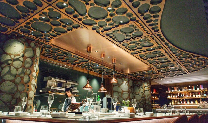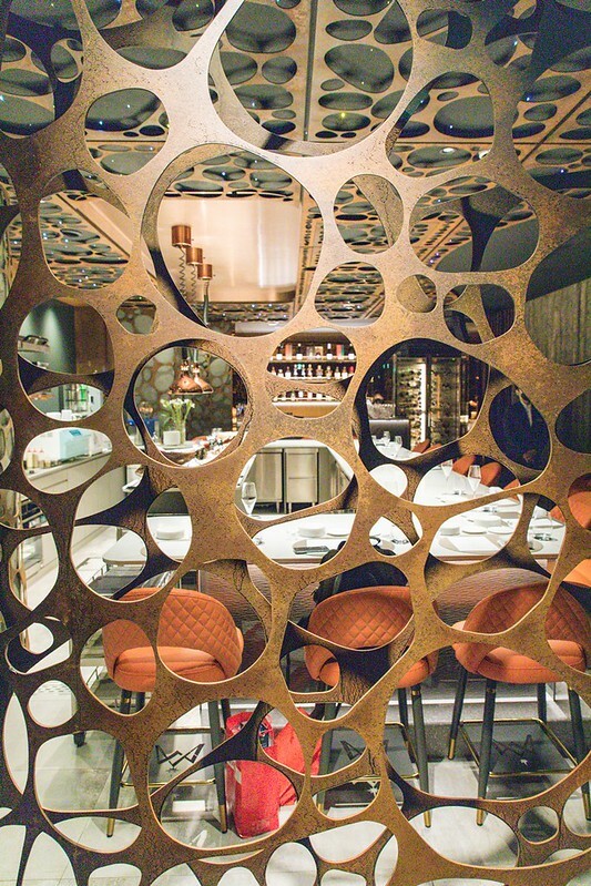 行前看了一下網路上還熱著的報導,形容用餐空間是洞穴風,推開厚重的木門後才驚覺,好像走進一棵像哈比人的木屋中,那些像是岩石,也像是細胞的不規則洞洞,也有一點樹紋的感覺。