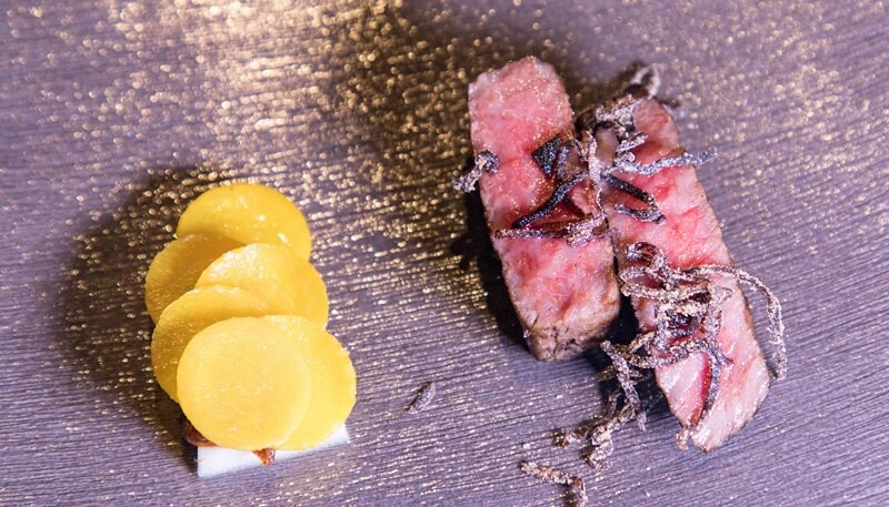 雖然選擇近江牛,這一餐的價位直衝9980...但我比較說這塊a5等級的近江牛絕絕對對是我在台灣吃過最好吃,最油最甜最嫩的日本和牛,好吃得亂九十糟......口袋夠深的,又愛吃日本和牛,真心建議給它花下去....。牛肉上面是調味的鹹昆布(日本人很愛這樣吃),搭配的是綠竹筍、油封蘿蔔水潤宜人,焦糖洋蔥。