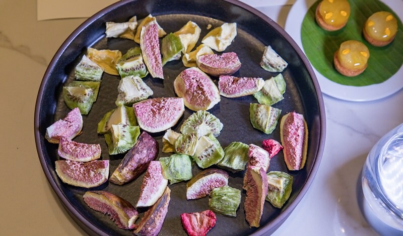 咖啡後聊到興性的Jimmy主廚又拿出一盤果乾,說這是用零下25度的風乾技術估做的果乾,看起來比一般的果乾還乾,但吃在嘴裡卻滿滿的水份,還有不可思議比例的酸和甜,和坊間賣的果乾完完全全兩回事,非常非常特別。