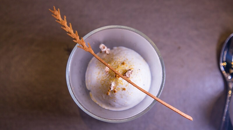 前甜點小麥 / 麥芽 / 檸檬, 上面是非常特別,用小麥爆米香作成的泡泡,冰淇淋是十分清爽的麥牙口味,底層有檸檬碎冰,上配上一支麥梗造型的泡芙餅乾,,視覺上帶著微微轉秋的期待,一整個超有一整個超有質感,口感綿細多變,味覺冰涼清爽,好像剛剛吃的主食一下全消化完畢xd