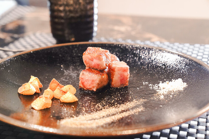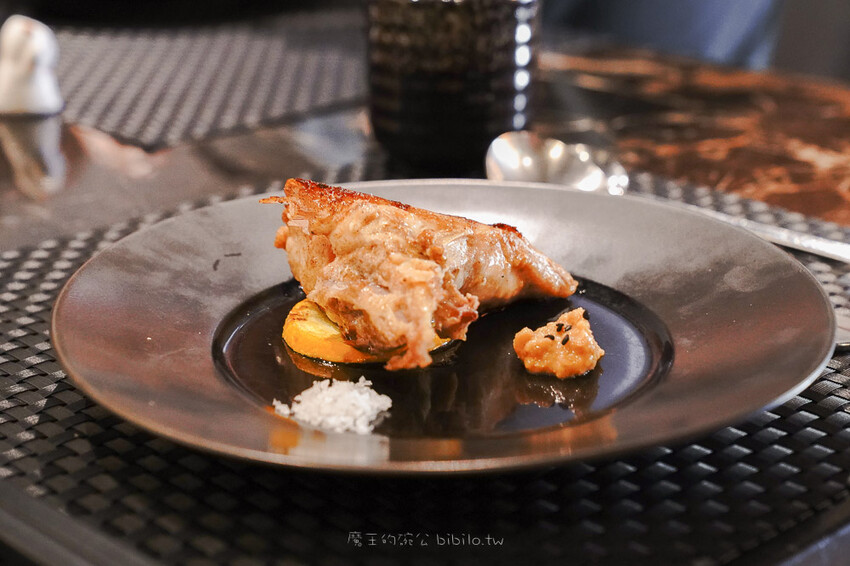 堅持不施打抗生素及生長激素方式飼養,煎到恰恰恰的桂丁雞,完全擄獲我們,師傅說,不先提供和牛,是因為怕吃和牛再吃雞肉會有落差,但一點也不會!!因為這份桂丁雞我認真覺得好吃到我欲罷不能狂點頭,我很怕吃有肉味的雞肉,桂丁雞因為是品種關係,皮不會厚且肉質鮮嫩,外皮酥到我懷疑師傅是施什麼魔法,香酥嫩,後方是胡椒鹽與松露鹽,可以適當搭配。