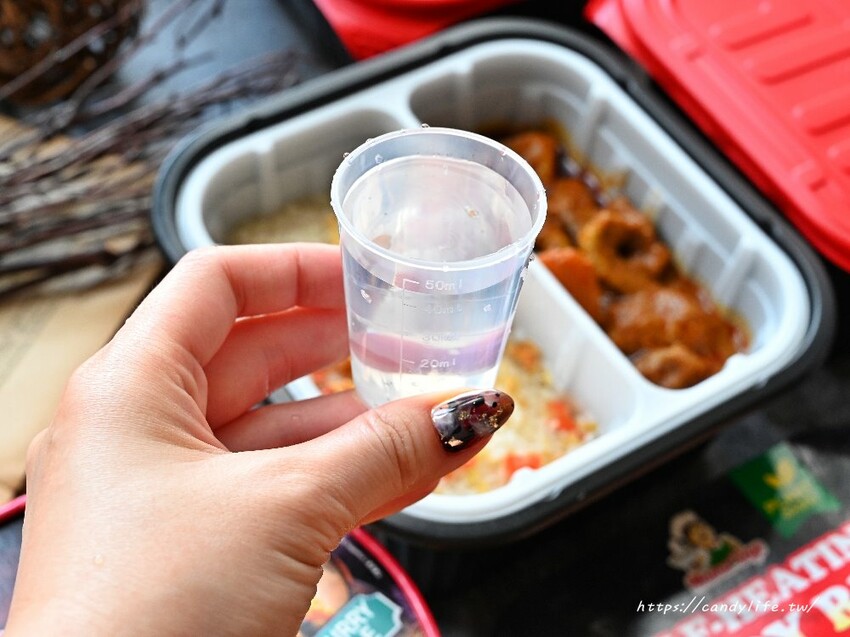 Mamavege自熱咖哩飯裡頭還有附上小量杯,真的超貼心,在米飯中倒入130cc的飲用水,揪著一樣跟著剛剛自熱火鍋的步驟就行囉