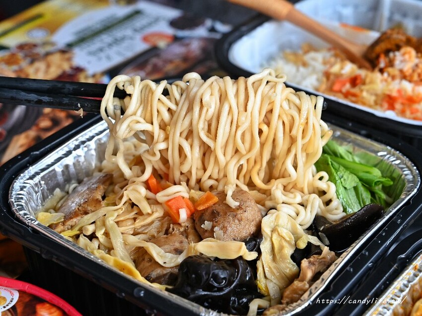 將包裝打開,裡頭附贈一個鋁箔碗、醬包、食材包、麵體、餐具、濕紙巾及食品專用發熱包,記得剛剛的紅色蓋子要留著,等等會用到唷
