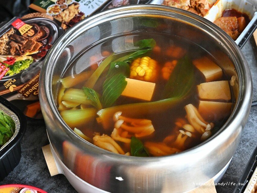 經過10分鐘後,熱騰騰的泰式東炎火鍋就完成囉,打開蓋子真的有夠香,湯頭濃厚帶小辣風味,裡頭的玉米也非常香甜可口,素丸跟素肉也不錯,煮得相當入味,還有馬鈴薯也好好吃,口感很桑呢