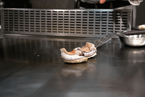 看著師父將活生生的帶殼鮑魚放上鐵板上,滋滋作響的鐵板,先蒸出一些鮑魚原有的水分,看著鮑魚從活的到熟的,於鐵板上扭曲伸展,看了其實有點殘忍,但其實又這麼新鮮。煎熟的鮑魚,師傅熟稔地在上頭畫了幾刀,美麗擺盤,在盤上抹了海膽醬,最後用細緻的檸檬分子泡泡覆蓋。