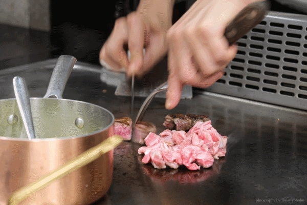 鐵板料理最看的就是師傅掌控鐵板與食材間溫度的關係,經驗十分重要,而也很開心這天服務我們的吳師傅經驗豐富,在料理過程中為我們聊聊料理,後來我還發現我跟他的大女兒一樣大,真是太有趣 XD 如果有到Hana鐵板燒用餐,推薦大家可以指定吳師傅喔!(店內只有一個吳師傅)
