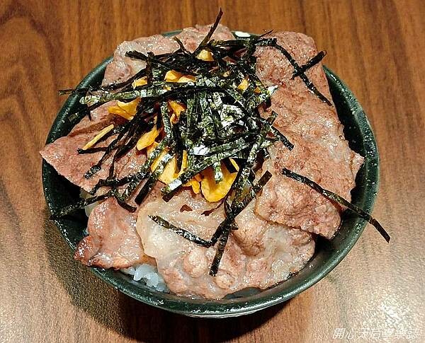炙燒牛肉飯,採用美國Choice 的無骨牛小排,肉質柔嫩甜美,咀嚼時迸出牛肉甜汁,搭配蒜片、海苔絲,口味更豐富