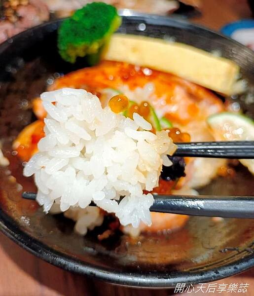 丼飯上舖滿炙燒過的焦糖鮭魚,獨特的料埋手法